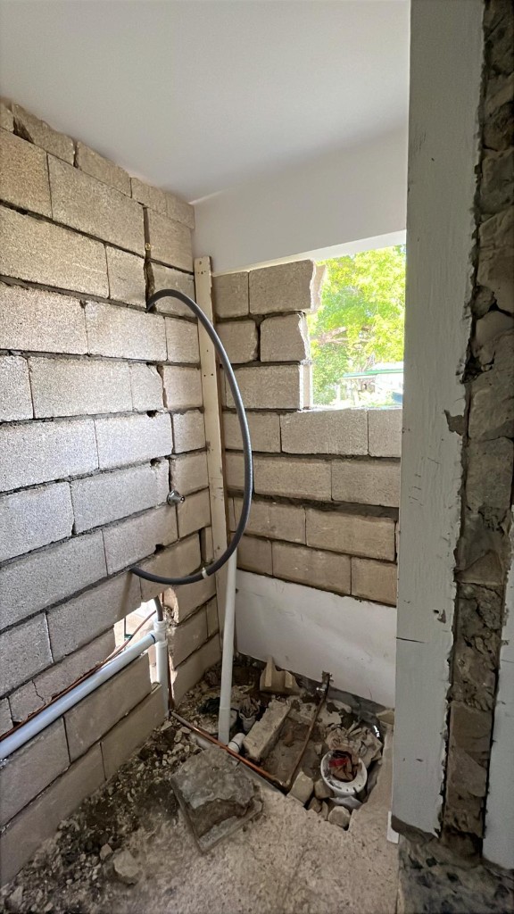 Renovación completa de la zona de ducha en un baño residencial-comercial para Airbnb. De la fase de obra con bloques y tuberías expuestas al resultado final: acabado en concreto microcemento, ducha tipo lluvia y piso en mosaico hexagonal.