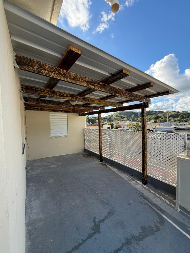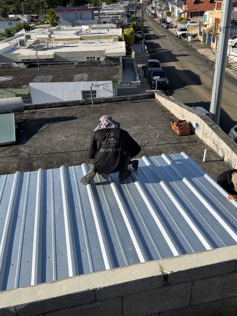 Instalación de techo en galvalume para área exterior residencial: colocación de paneles corrugados sobre estructura de madera tratada, creando cubierta para patio o carport con acabado durable y estético.